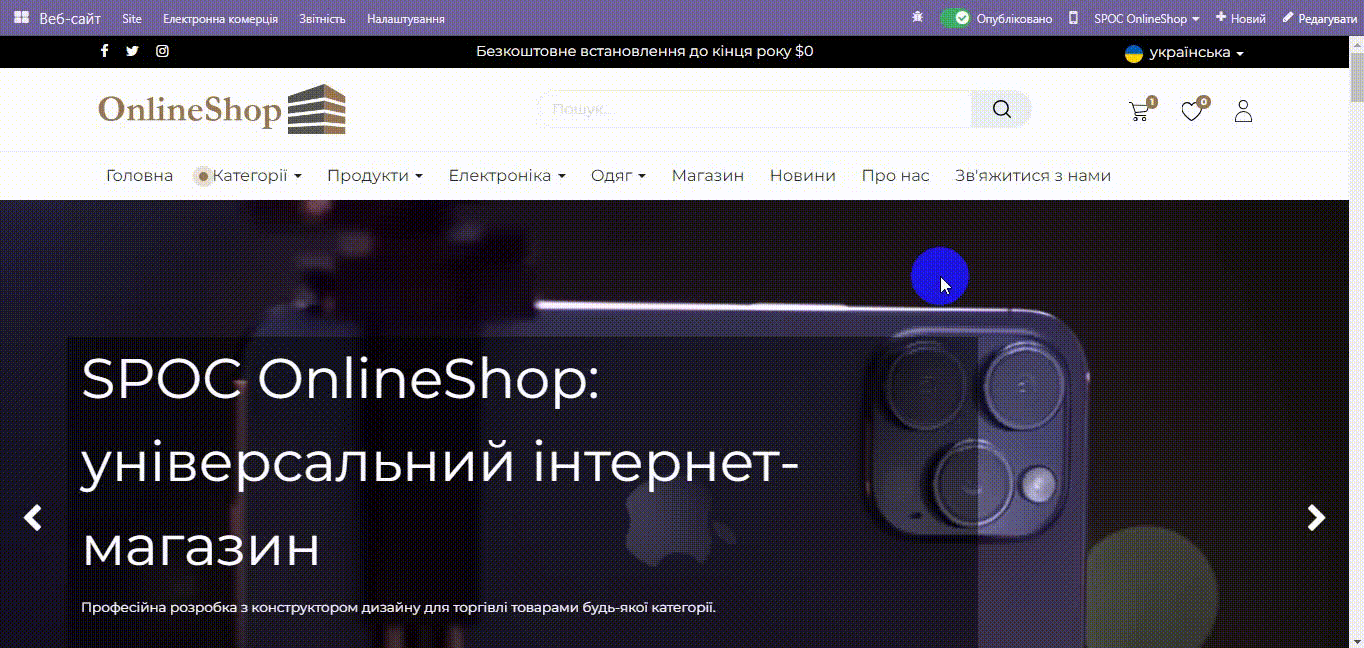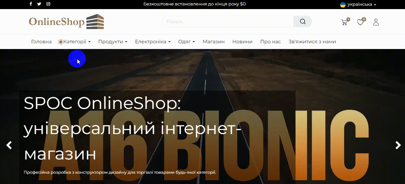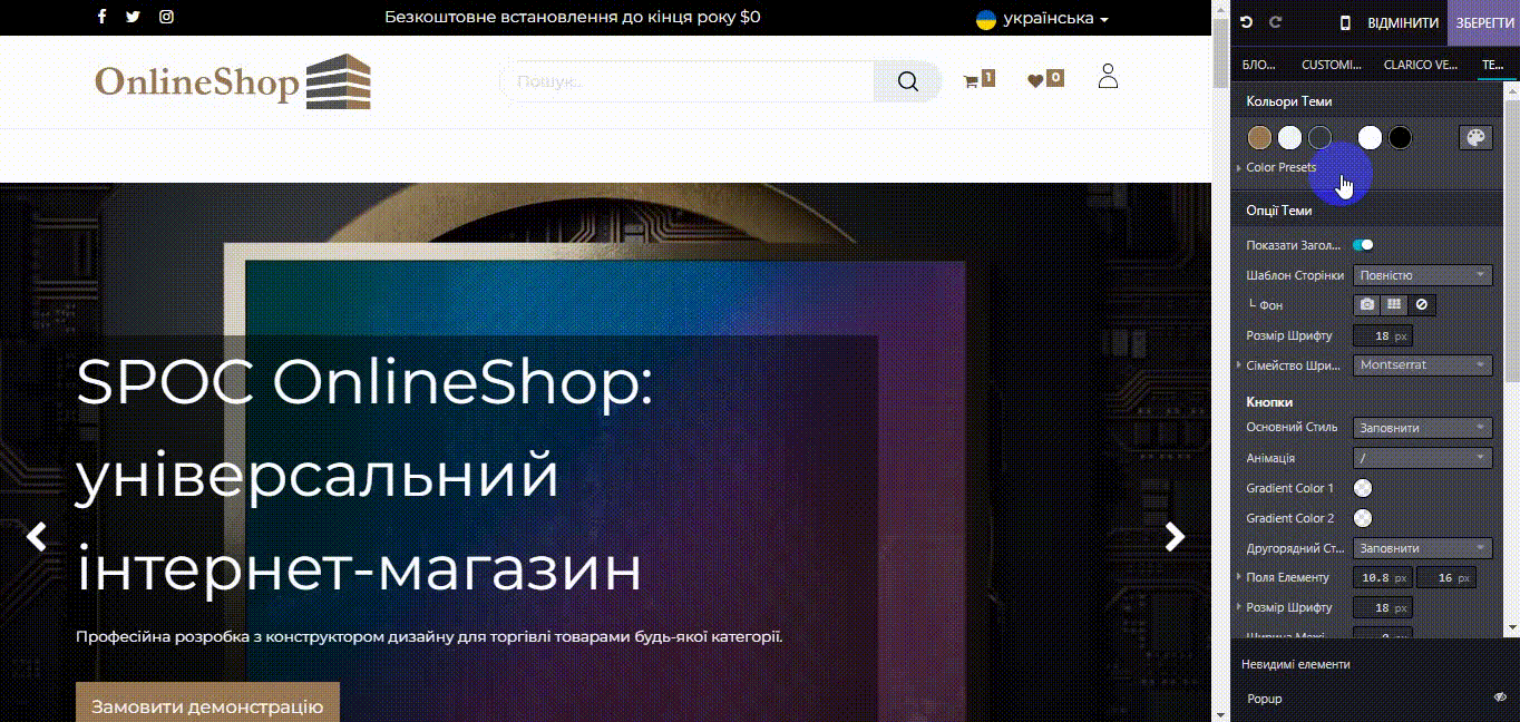 Можливість вибрати будь-який колір, варіант меню, розмір головного банера, розташування рекламних банерів, відображення товарів, новин та фільтра каталогу.