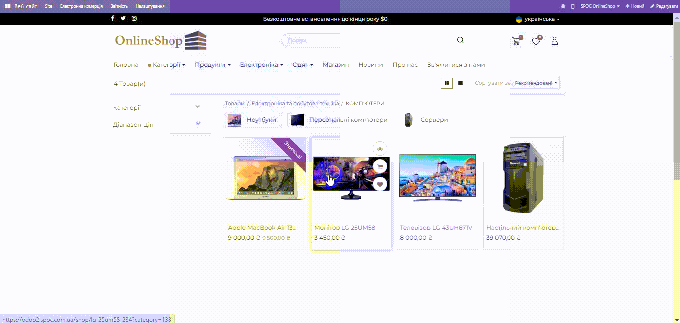 рекламних банерів, відображення товарів, новин та фільтра каталогу.